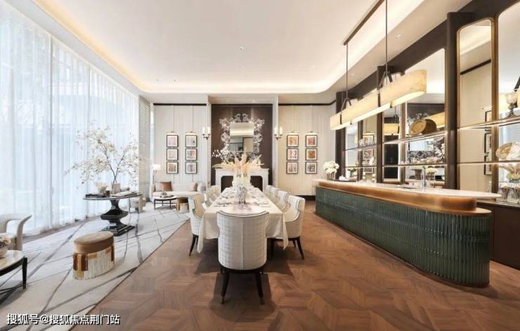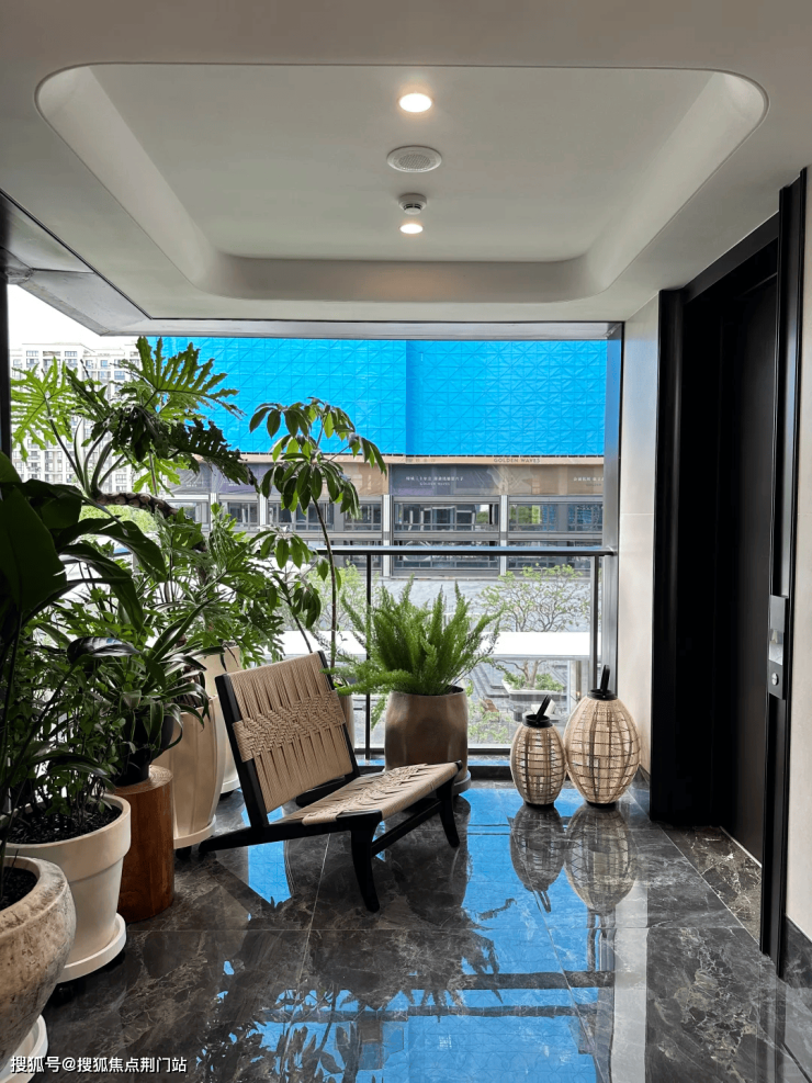下沉庭院以约6.15米高的悬挑水帘、水中下沉卡座,构筑行走于水上的通行体验,与地下配套用房对话。地上地下的双园驱动,以直径约2.5米的雅典黑金花水钵为起点,以直径约2米的黄金麻整石水钵为终点,通过金澜线条的延续,串联景观故事线,回应湖映金沙的营销价值。