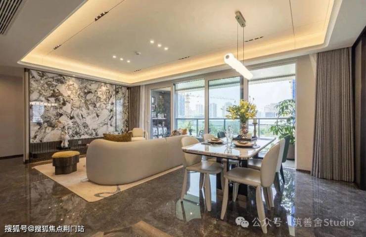 在宽阔的挑檐与全景落地窗的映衬之下,30米超宽门庭显得气吞山河,犹如画卷中描绘的潮语臻境府华美起笔。四根精美雕刻的奢石罗马柱,典雅挺拔,支撑起高达9米的门楼,金碧辉煌的穹顶在两侧镜面水景的映射之下,光彩流转,而细水潺潺,隔绝了外界喧嚣,步入门内,即刻仿佛步入迪拜帆船酒店的奢华境界。