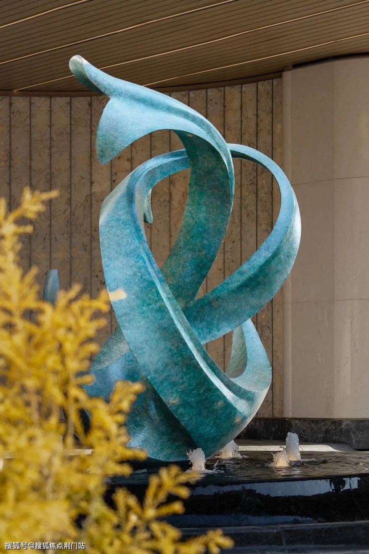 前场预留酒店环岛落客区,对标「鱼跃飞鹭」的水景雕塑矗立,基座采用乌克兰进口幻影蓝石材,镶嵌蓝色结晶,如梦似幻。