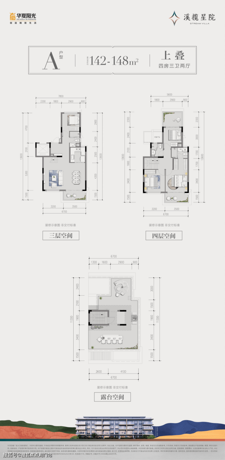建面约142~148㎡上叠:约6.7m餐客连厅/豪华主卧套房/顶层景观阳台/U型厨房