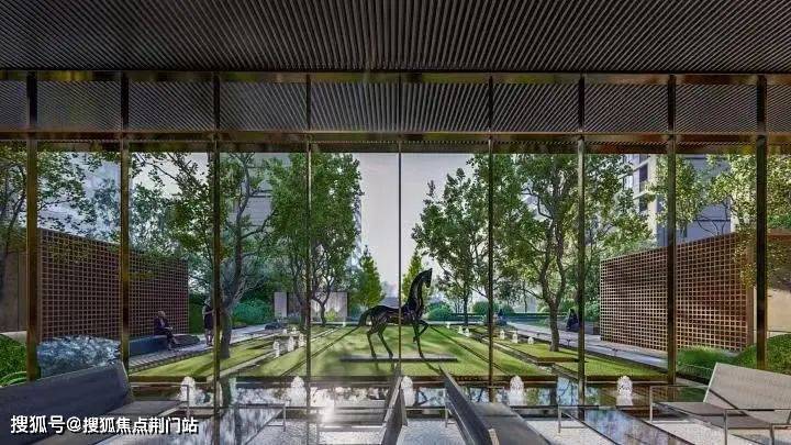 汲取四季酒店设计精髓,于社区主入口打造豪华酒店大堂式归家设计,以迎宾落客区--会 所式大堂--摩尔会客厅的渐进式排布,勾勒出入境--入画--归影的三重归家仪制。落客区采用酒店泊湾式环岛,尊崇与仪式融贯一体;会 所式大堂融入“会客厅”理念,空间纵深开阔,给予业主更多的舒适便利;摩尔会客厅叠石翠景,两侧灵动水系映泉满堂,一步一景,各有天地。