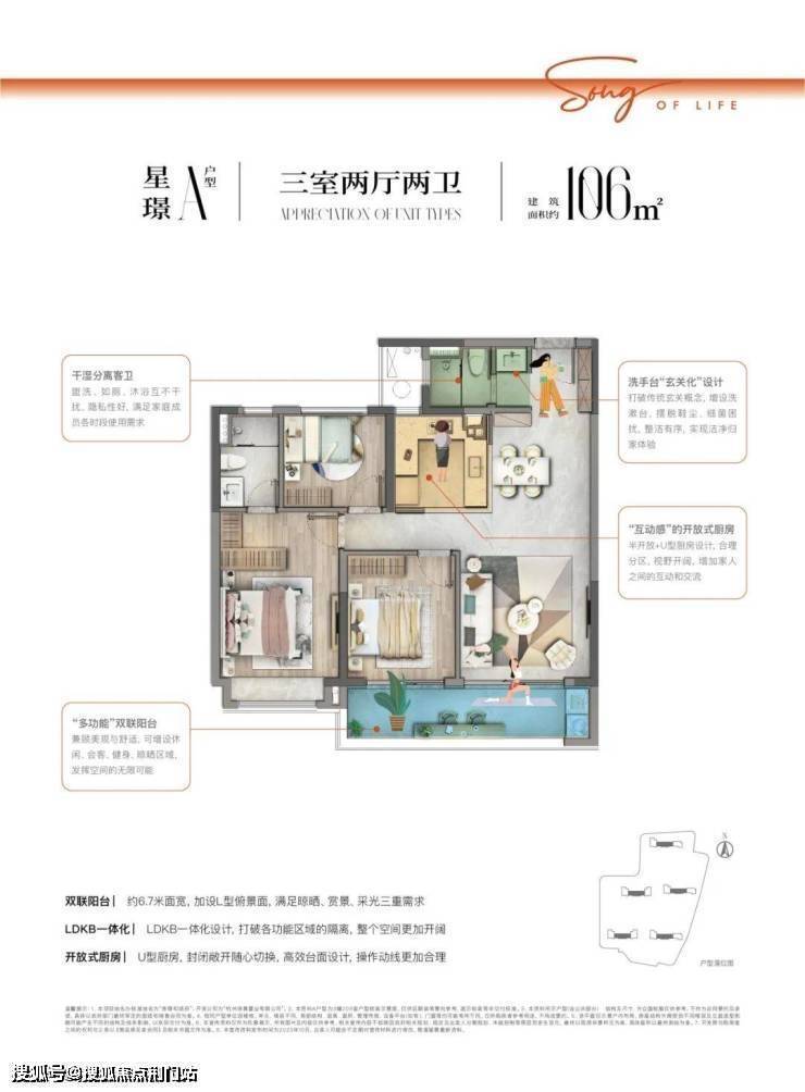 约106㎡户型点评:双联阳台约6.7米面宽,加设L型俯景面,满足晾晒、赏景、采光三重需求,LDKB一体化设计,打破各功能区域的隔离,整个空间更加开阔,开放式厨房 U型厨房,封闭敞开随心切换,高效台面设计,操作动线更加合理