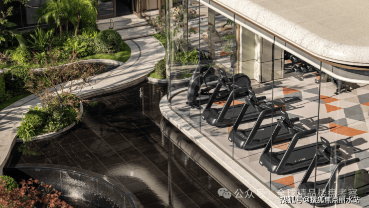 一个“浮岛”般的玻璃BOX轻盈置于景观之中,内含恒温泳池、健身房、网球室、party房等多功能社交空间,结合跌瀑水景,打造出静谧与动态交融的度假式体验。