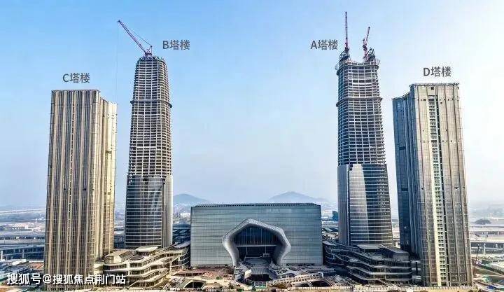 云门中心,A塔楼结构高度达到301 米,云门之眼塔冠即将呈现,B塔楼已封顶,顶部钢结构安装中,C、D 塔楼外立面幕墙完成 90%,室内装修中;