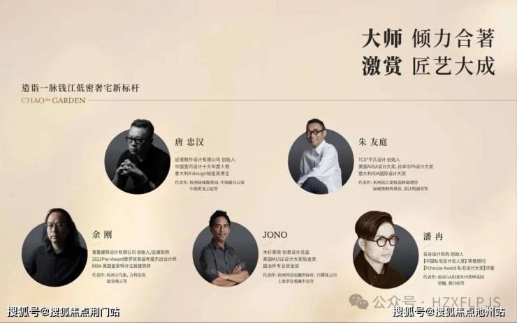 力邀近境制作创始人唐忠汉、TCD²平仄设计创始人朱友庭、木杉景观创意总监JONO、名谷设计创始人潘冉、青墨建筑设计创始人余刚5位设计名家重磅携手。集匠艺之大成,共筑金沙湖当代奢宅新标杆。