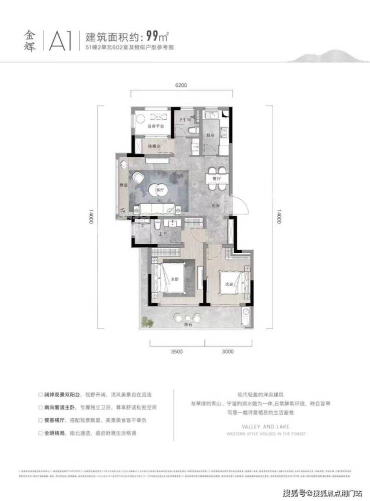 户型点评优势:双阳台设计,优质匹配湖山美景。客餐厨动线合理,观景飘窗连通了室内室外两重空间。南北通透、分区合理,尤其是储藏室的设计,十分贴心。99㎡的大两居,恰到好处地放大了各个功能区,整体看过去十分舒畅