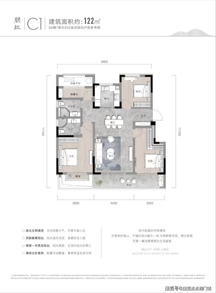 户型点评优势:122㎡的三房两厅两卫设计,留出了独立的玄关收纳空间与落尘区,十分贴心。三个房间分布在三个方向,空间都不显局促,主卧更是自成一体。客厅连阳台,一动一静之间景观尽收眼底。