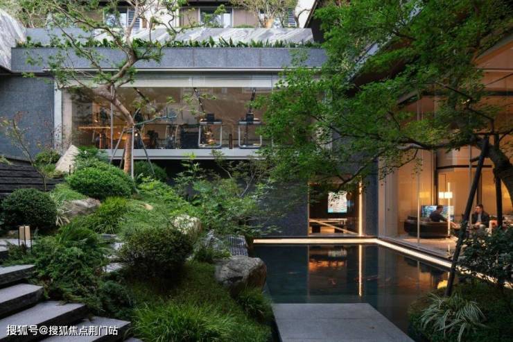 为此,立体庭院布局以中央水体为核心,建筑体量环抱形成向心秩序,有效强化了场域的凝聚力。游步穿行间,巨幅玻璃借现代框景手法,将外部景致抽象为动态立轴,通过尺度对比与光线渗透构建多重叙事。这一策略延续了宋式园林注重精神性与自然交流的美学,在狭小用地中拓展出幽深静谧、虚实相生的意境体验。