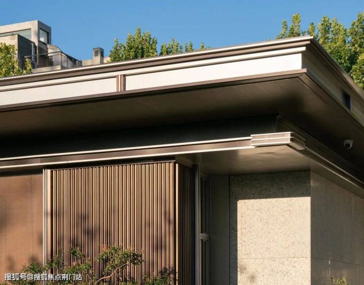 檐口部位对传统“版引檐”进行现代转译,檐下为模仿椽子形式的单元化金属格栅,工业化生产的构件极为纤细且经久耐用。