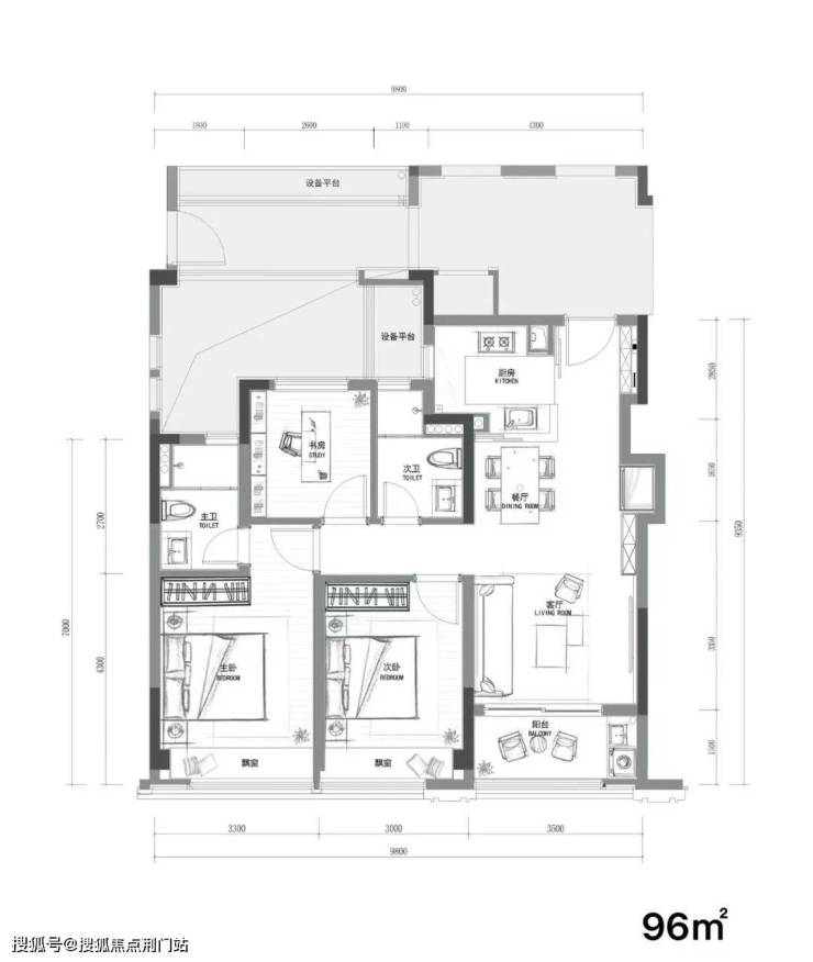 建面约96㎡ 三室两厅两卫: