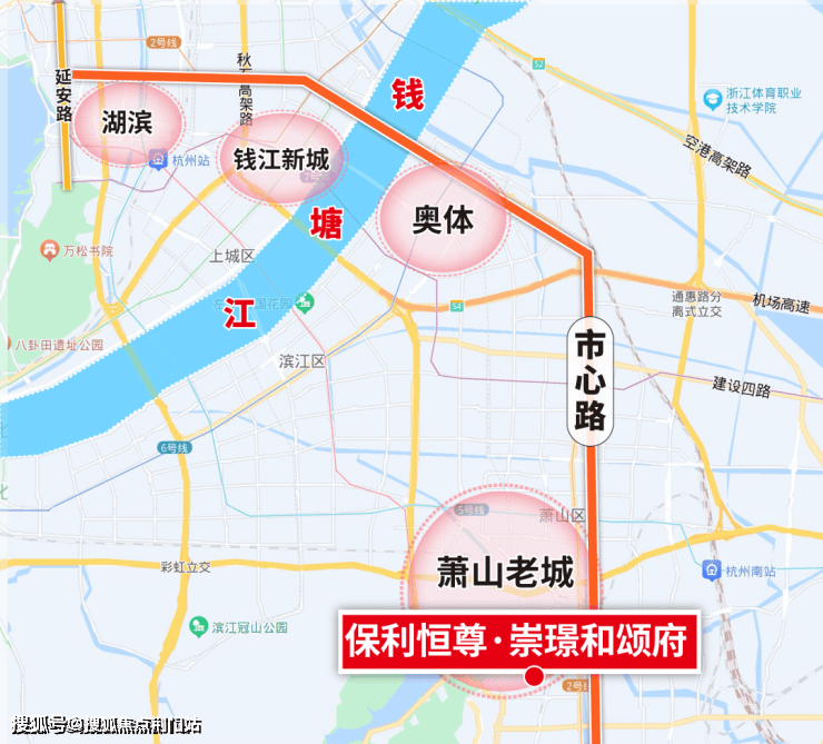 西侧蜀山路则与另一条中轴博奥路相连,畅通、辐射 萧山、奥体、滨江及对岸钱江新城。基本铺设在市心路下的地铁2号线与项目紧密相连,通过潘水站(直距约800m)、人民路站(直距约1km),即可畅通全城。