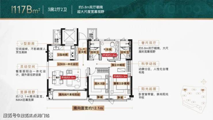 LDKB通透格局,U型厨房,畅享宽敞餐厨空间;
