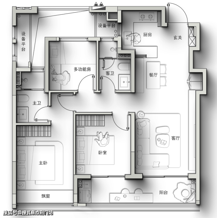 不仅做到了大边厅+四房,而且还带一个进深约2米的转角阳台(很多豪宅阳台进深也不过1.8米),就像自带一座空中花园。