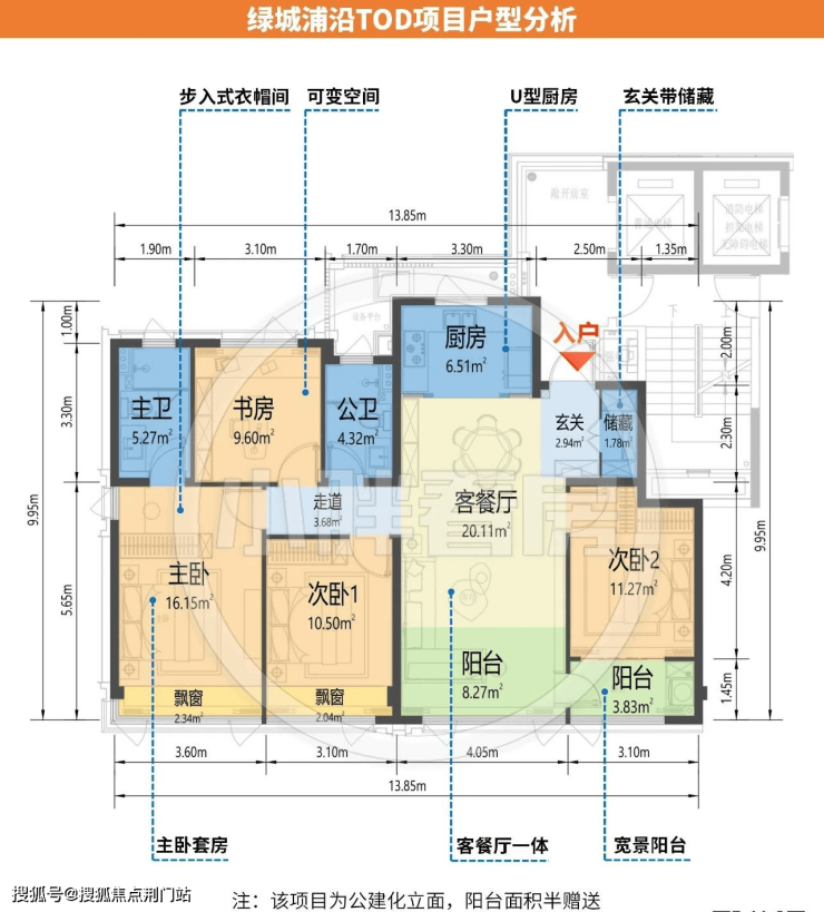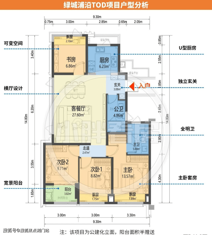 起步约105㎡户型,进门就是通铺的约10米的收纳墙。