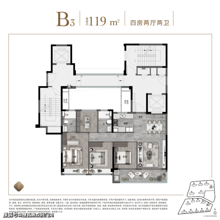 我们一个一个来看,先来看看入门级四房,建面约119㎡。