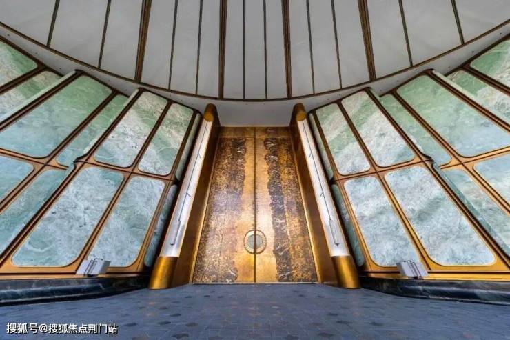以杭州折扇为灵感而造的超尺度门庭,12片巴西进口百达翡绿玉石屏风,由非遗传承人朱炳仁团队打造的巨幅铜门,“玉镜流光”雕塑,大堂内八根巨幅立柱,还原了扇骨的形态,汝窑冰裂纹的陶片镶嵌,地面拼花运用江南花窗元素……