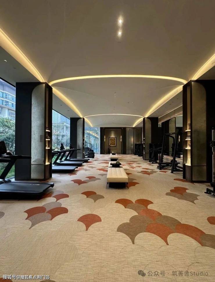 小区大门以“云扉初开”为灵感,打造具有仪式感的礼仪入口。宽约66米、高约8.6米的恢弘门庭,与酒店式归家大堂共同构筑,打造出极具仪式感的序厅,瞬间开启归家的尊崇心境。入口处精心打造的树阵水院,以静谧尊贵的氛围迎接归家。巧妙运用高差设计,通过层层递进的景观节点,优雅地引导业主步入社区深处。