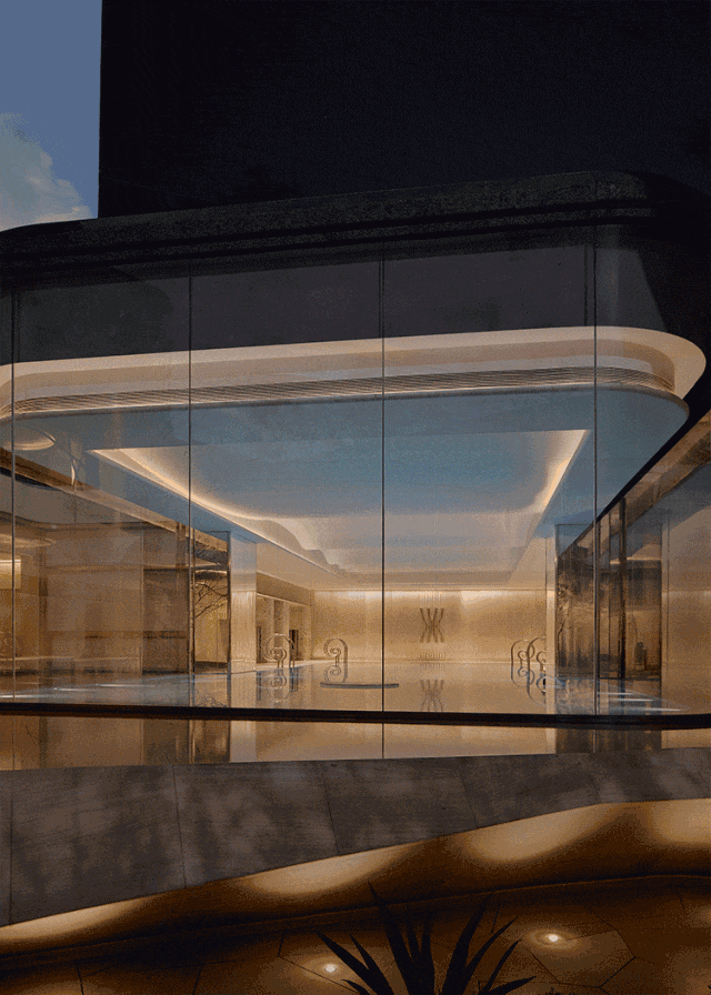 第二重门厅参考台北嘉佩乐酒店的叙事风格,以一座环形的前场庭院作为业主归家的情绪整理空间。环岛落客区打造“天光云廊”,营造从繁华到宁静的空间过渡,开启度假般归家体验。