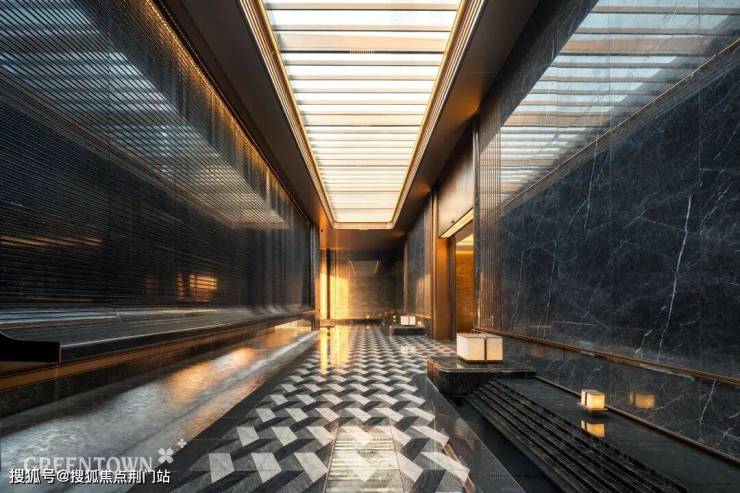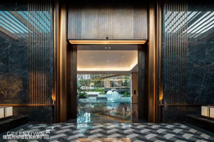 主入口知·云栖,取意西湖十景以"洄游"为理念,超52米跨度的回字形布局,重构传统"四水归堂"空间序列,约2.4米“流光礼宾” 塔冠,如悬浮的美学灯塔,与金色挑檐相映成辉,全封闭式阳台勾勒建筑轮廓,让立面如镜幕般收纳约30公里江岸鎏光!