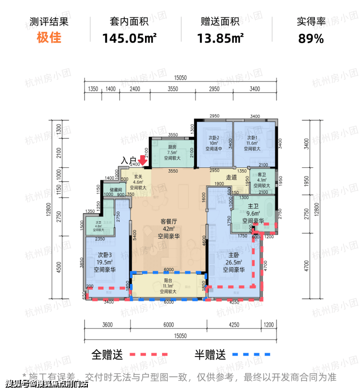 1.建面约145方3+1房2厅2卫:(注意下图客餐厅位置实际为x空间,交付时可能会隔成房间,所以也可以算4房)