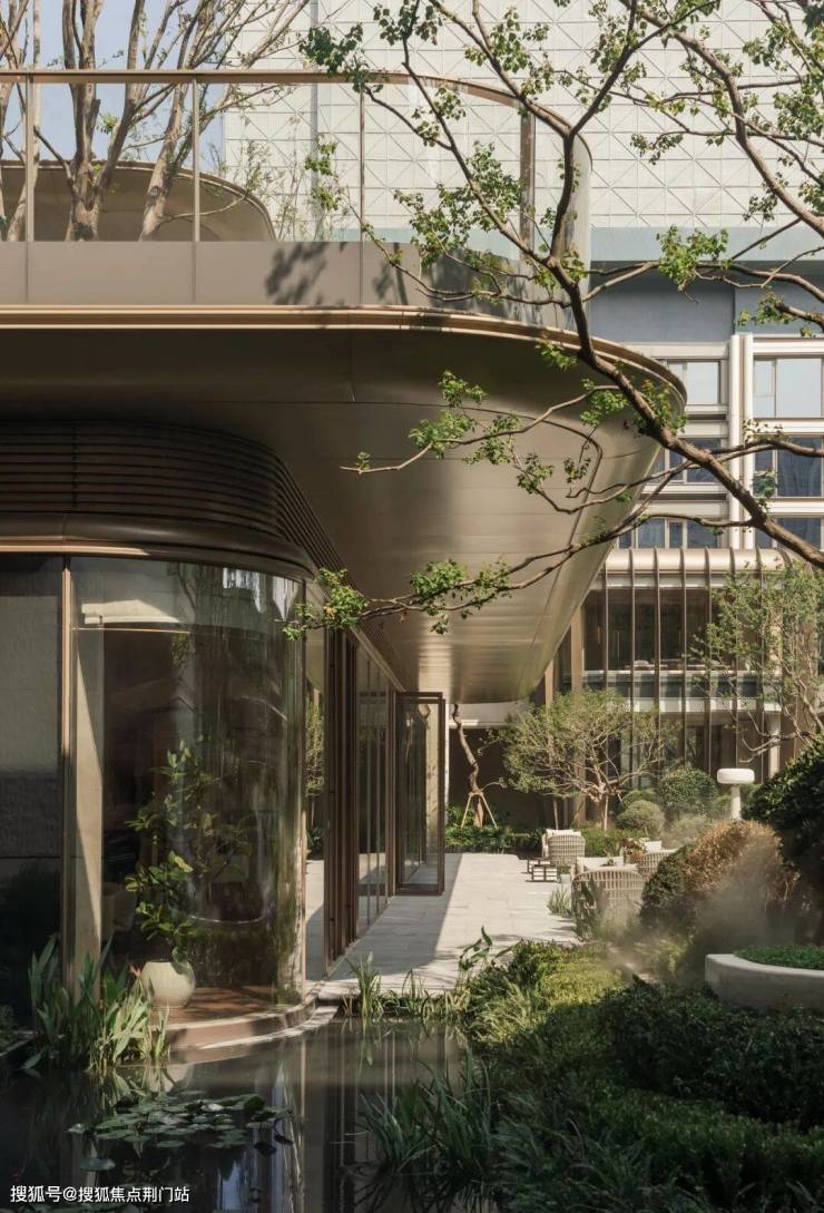 庭院景观以西湖荷花为核心设计元素之一,水桥的形态则借鉴并转译西溪湿地的自然肌理,使整体空间在文化意象与自然特征之间建立关联。