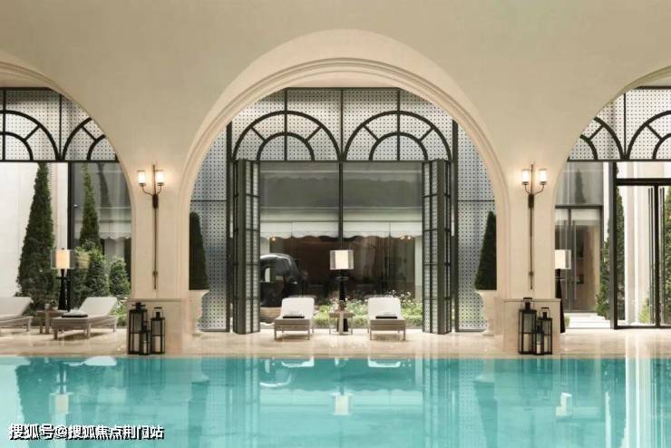 地下恒温泳池三面采光,顶部是15米玻璃天顶倒映着空中花园水景,泳池底部300万片马赛克拼出名画《睡莲》局部。两侧黑色铁艺屏风外是下沉庭院,让业主在游泳的同时也可看到外部的自然景观。