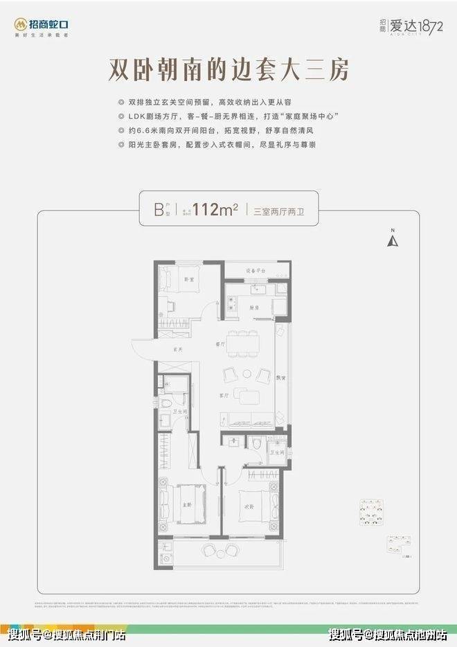 与常见的中间套户型不同,招商爱达1872的约106㎡,南向有3.5开间,面宽约有11.7米。如此一来,可以将更多南向开间面,留给餐客厅,同时外接约5.6米长的南阳台,让公区显得更为阔绰。