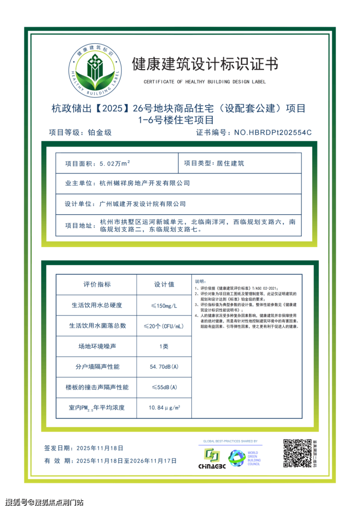 运河樾是目前杭州首座中国城市科学研究会认证的铂金级健康奢宅,以国家级权威标准打造,也是「好房子」健康标准中的最高等级。
