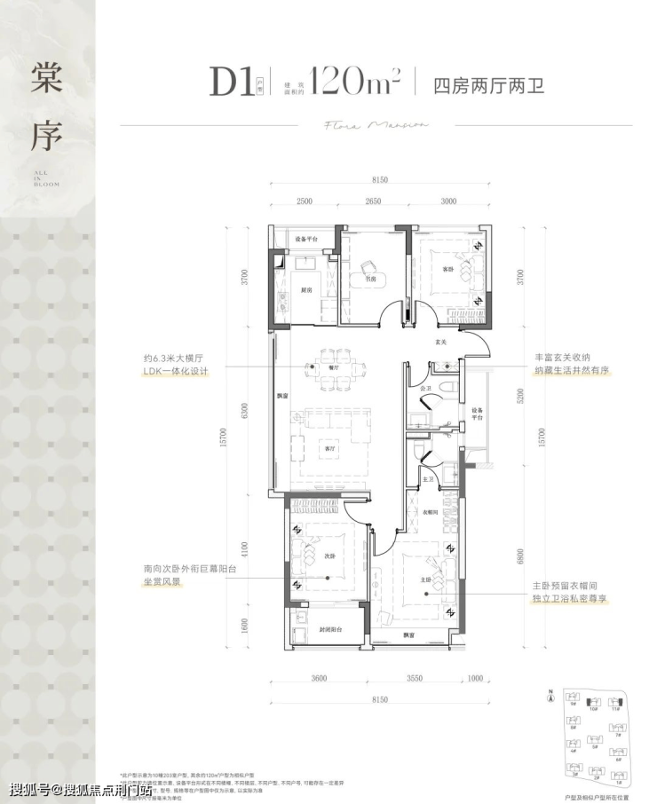 >四面铝板 封面主城「四面铝板+大面玻璃+温润石材」奢华组合,封阳台设计增加空间利用率。(注:内天井、外天井、设备阳台的外墙面为涂料,底层局部石材,具体以商品房买卖合同约定为准)