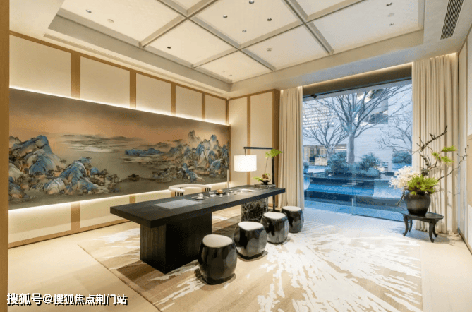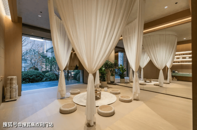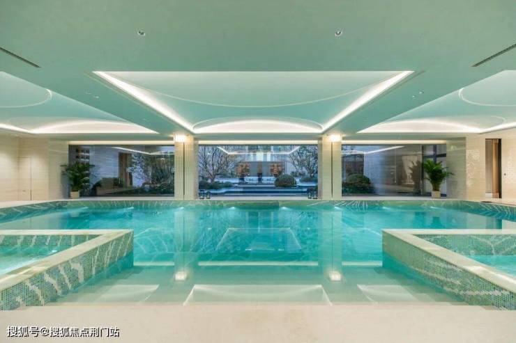 室内恒温泳池、健身房、室内高尔夫、私宴厅、茶室等高端会所配套俱全。3000㎡地下会所,融合了良渚玉琮纹样与现代材质,天珺为其取名:玉石枫林会所。