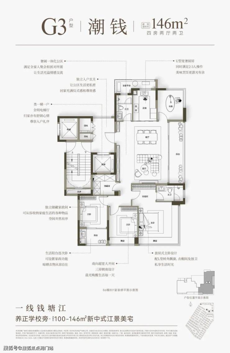 建面约146㎡户型分为“横板”和“竖版”,“横版”是四开间朝南+大方厅,“竖版”有大边厅+超长转角飘窗的“全景舱主卧”。