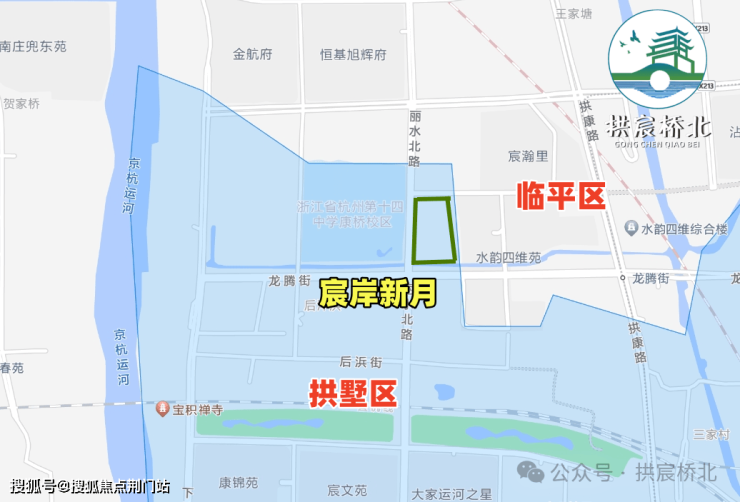 绿城·宸岸新月,也就是运河新城单元 GS1001-05地块,它位于拱墅区康桥街道龙腾街与丽水北路交叉口,步行距离在建的15号线龙腾街地铁站约650米。