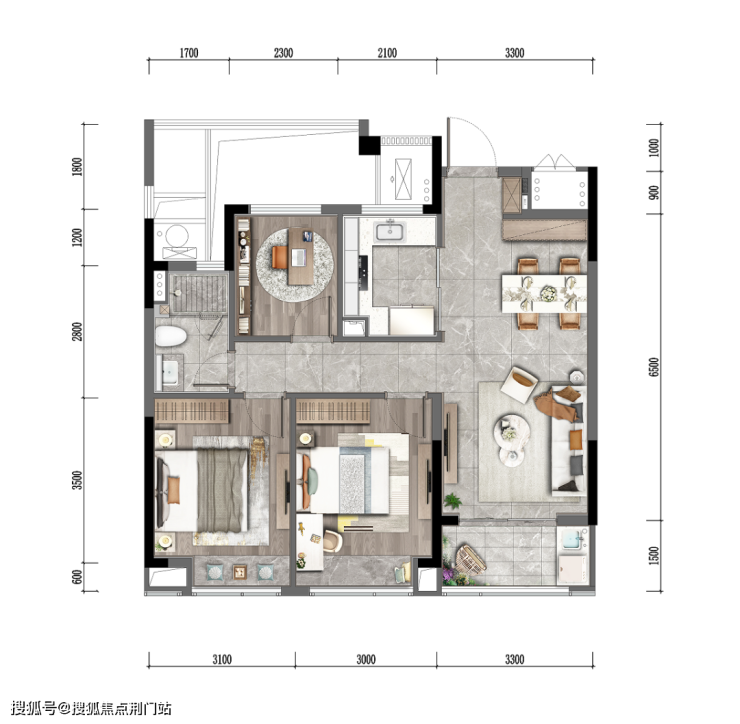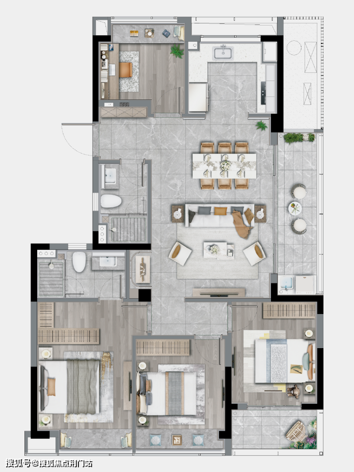 LDBK一体化的公区,充分实现了家庭成员间的互动;除了边厅外接的阳台外,南向次卧同样设计了阳台,兼顾了景观和晾晒的需求。
