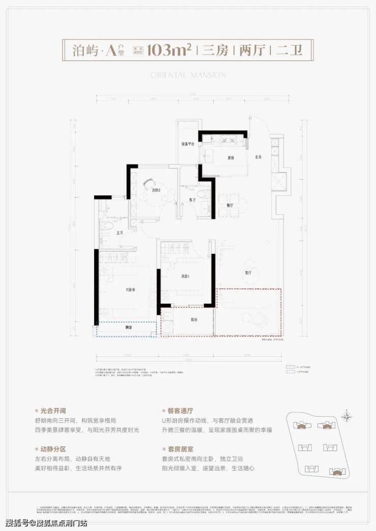 建面约 103平,三房两厅两卫。 三大亮点分析:① 南向三开间, 朝南次卧带阳台,客厅联通阳台后,空间阔绰;② U型厨房且半开放设计,玄关含 S墙冰箱位,利用率高、采光更优;③ 新规户型 得房率高达约90%以上。