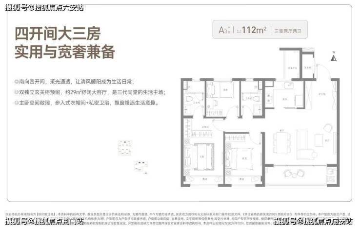 建面约112㎡的三房两卫,是双卧朝南的边套全明大三房,适合家庭人口少,但对居住舒适度要求高、且有一定经济实力的购房者。