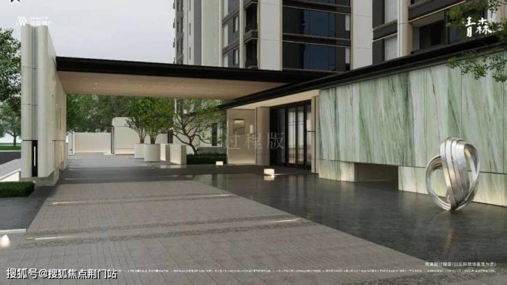 不止是壮观——他们以大尺度内退为序,贝金米黄、青绿色香格里拉石材、乔木、雕塑交错其间,非对称的自然布局,让整个界面如一座开放的艺术馆。