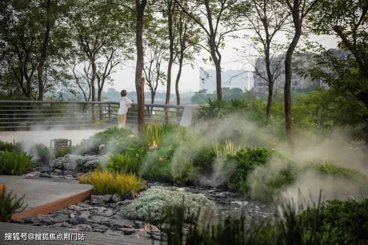园区以四季植物搭配、森系香氛、专业音响等设计,营造“四时四感”的沉浸体验;并配备智能降温降尘系统,通过水喷雾系统与景观雾森,优化微气候,让夏日归家多一份清凉。