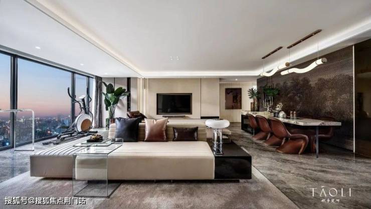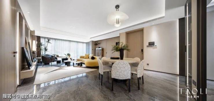桃李团队采用了“上、中、下”三个层面的“无界设计”,如顶部空间采用“无梁化设计”,大大强化空间尺度感,地面则呈现出“一镜到底”的空间感,中间层的“无界”,来自于从玄关、客厅、餐厅、卧室的连通性,及局部墙面采用一体化木饰面材料——从色彩、空间、体积上,实现了全新的体验。