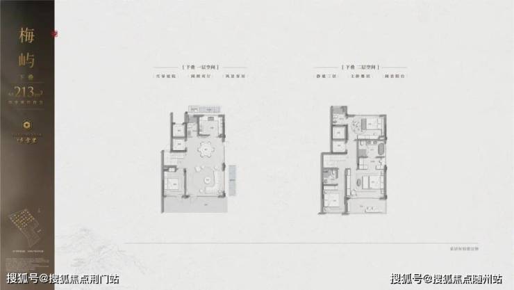 建筑立面:古今交融的诗意表达:外立面以香槟金铝板为基调,搭配蓝眼睛石材与玻璃幕墙,融合传统歇山重檐、纳福悬鱼等元素,既保留宋式建筑的对称美学,又赋予现代建筑的轻盈通透。合院组团采用三面庭院设计,L型景观面与环绕式檐廊,将超山梅影、丁山湖光引入每一扇窗景!