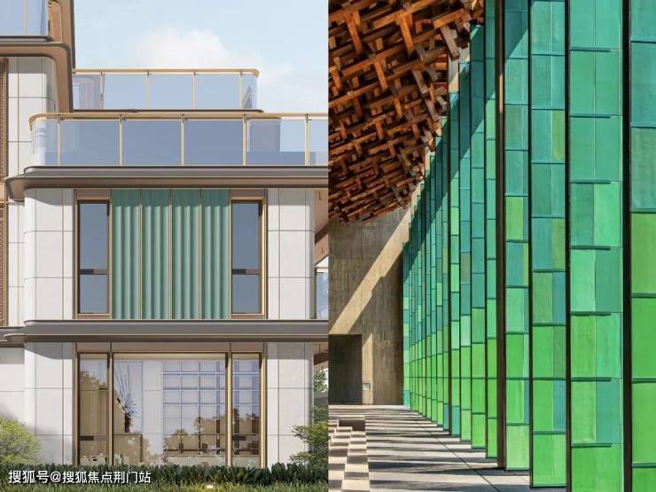 金色铝板线条和大面积玻璃搭配的外立面,乍一眼看去很现代,也很贵气。但是下一秒钟,你就会瞬间被它的天青色陶板,吸引所有注意力——