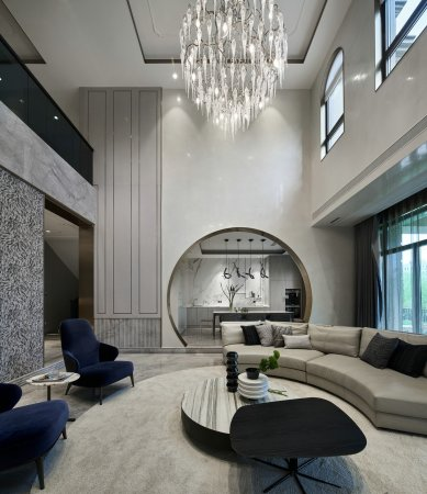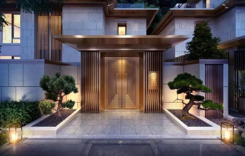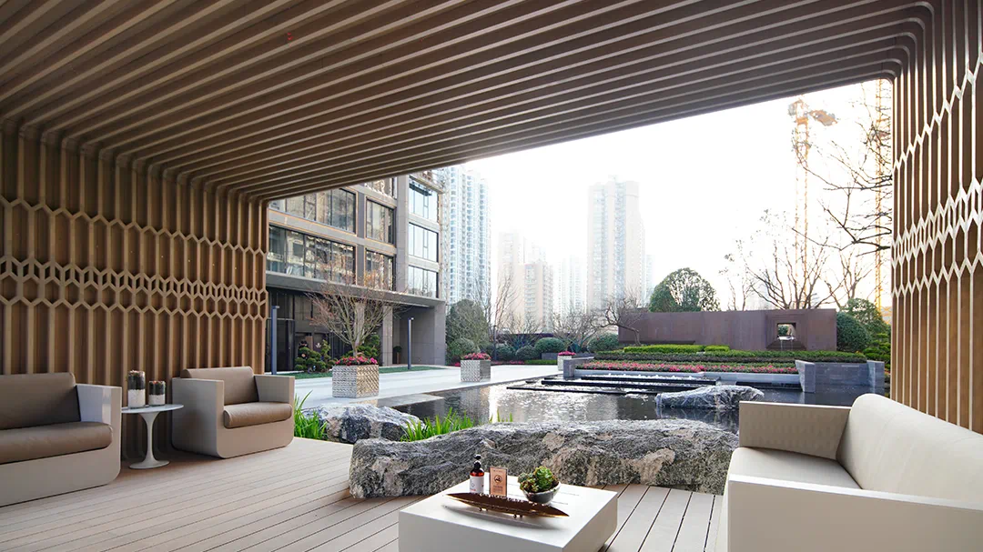 超高挑高无墙体的入户大堂外,将归家入口空间延展扩大,打造出一个私家花园,室内外空间相互呼应,将室外景观延伸至室内。