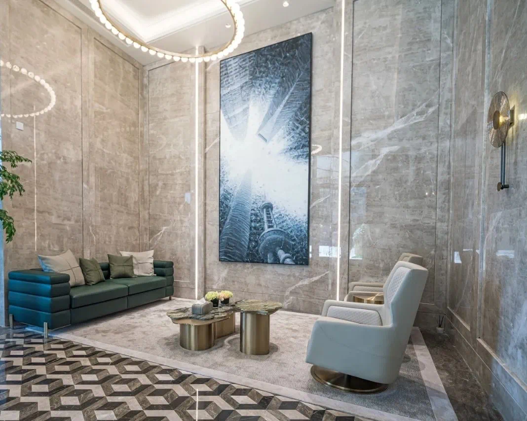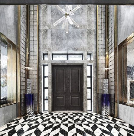 外立面用伊朗进口的“蓝眼睛”石材,辅以彩金勾勒,经典的Art deco设计,配上大尺寸玻璃落地窗,没有传统豪宅厚重感,更轻盈,极具现代美。