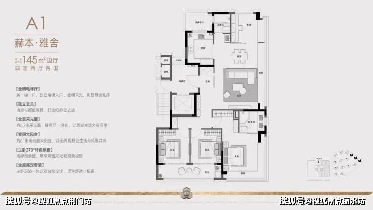 建面约145㎡的户型:项目采用创新的"两梯两户"设计,通过巧妙的空间规划实现类一梯一户的尊享体验。双电梯厅以防火门分隔,确保住户私密性。专属电梯直达户门,10平方米的270度转角入户花园,兼具采光通风优势,将功能性与仪式感完美结合。