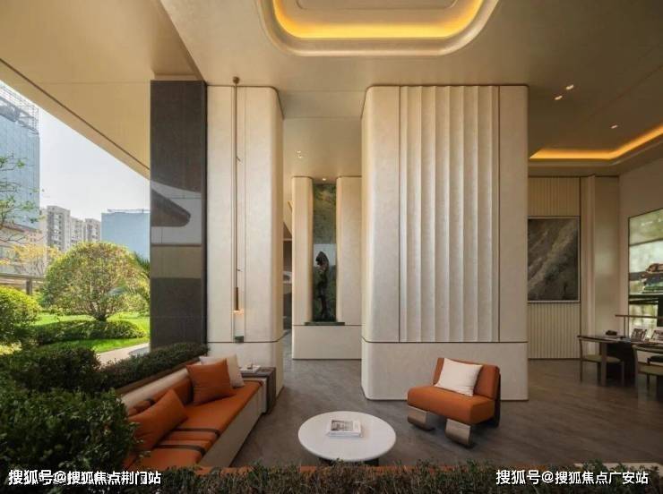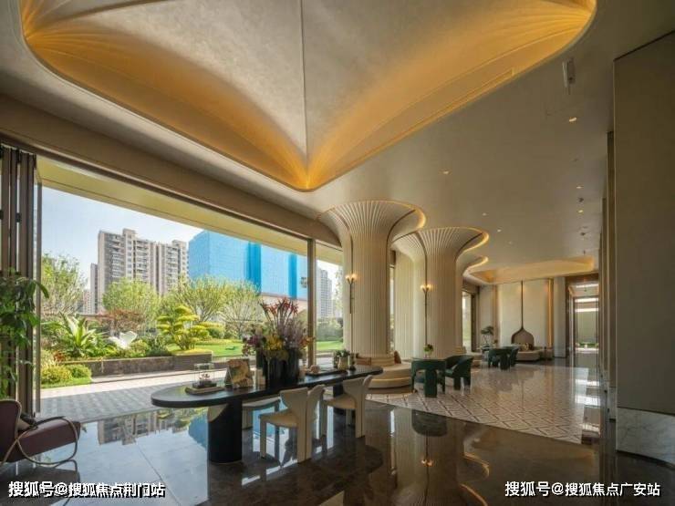 项目邀请GAD操刀建筑设计,在建筑格局上,项目呈"北斗七星"状错落分布,楼间距拉大的同时,视野广度、采光时长也变得更有优势。建筑立面采用“四面铝板+金色边框+大面积玻璃”,并对立面进行体块切分,构建了极致的窗墙比、巨幕视窗和向上升腾的屋顶造型。加上南向全落地玻璃,转角圆弧玻璃工艺,中轴线天际线和大城西“绿肺”尽收眼底。