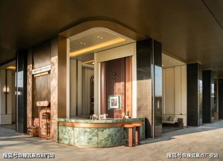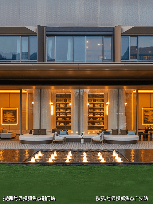 时舟里大门气势恢弘,利用地上架空车库的做法,打造了约9米高的双层高大门,鎏金天幕铺开,横向70米宽的尺度让入口的空间气场拉满。