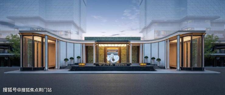 主入口“学院派”门厅,长约45米,采用双C环抱式造型,设计灵感源自西湖大学,两侧约7米高宝格丽绿奢石景墙,搭配汉白玉奢石海棠雕塑,超强气场扑面而来。