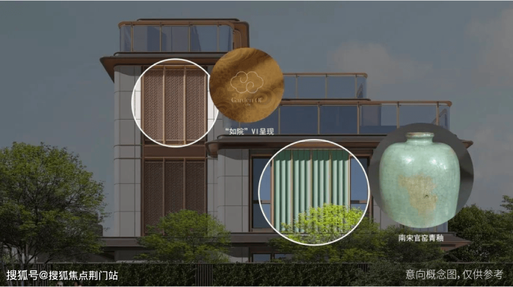 将故宫博物院收藏的《四季山水图》避风䈋装饰构件提炼出来,镶嵌在立面上,完美展示古典张力和现代艺术气质。