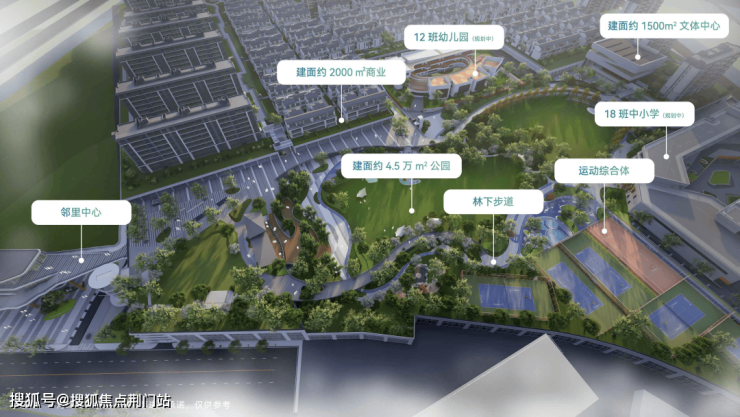整个项目由两宗地块组成,占地约425亩,总建筑面积约48万㎡。是一座涵盖约4.5万㎡公园、幼儿园、九年一贯制学校、文体中心、邻里中心等复合业态的超大“公园城市”。