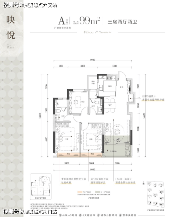如建面约99㎡的三房两卫户型,动静分区,采用三开间朝南设计,可以放下双开门冰箱哦~配备双飘窗和大阳台,保证了室内通风明亮,同时两个卫生间的设置,解决了早上排队使用的问题。