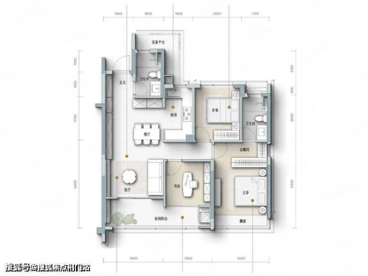 四开间朝南设计,主卧套房设计,宽景封闭式阳台。